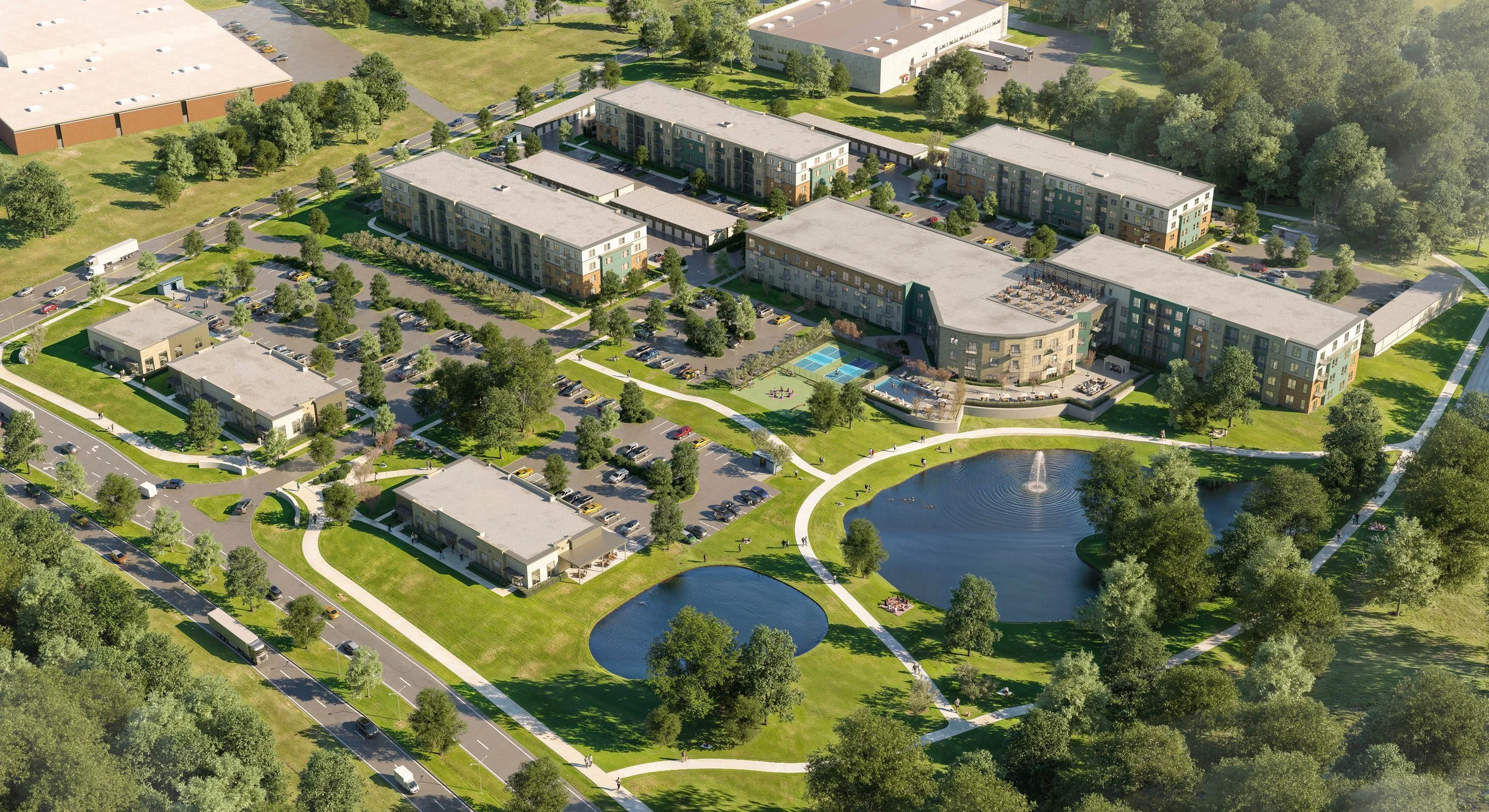 Former day care facility at the entrance to new development of 307 apartments and 169 townhomes